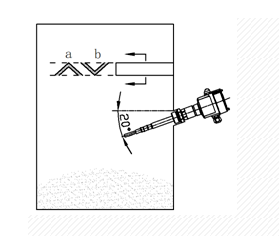 為了確保測量的準確性,可以將射頻導納料位開關水平安裝。如果測量誤差允許在幾公分范圍內,建議將設備向下傾斜約20°后安裝,可以避免由于物料在探頭上的堆積而造成的測量誤差(注:纜繩型射頻導納物位開關禁止水平安裝)。對于一些特殊應用場合的安裝,還需要增加防護擋板,儀表才能更可靠工作(見下圖)。